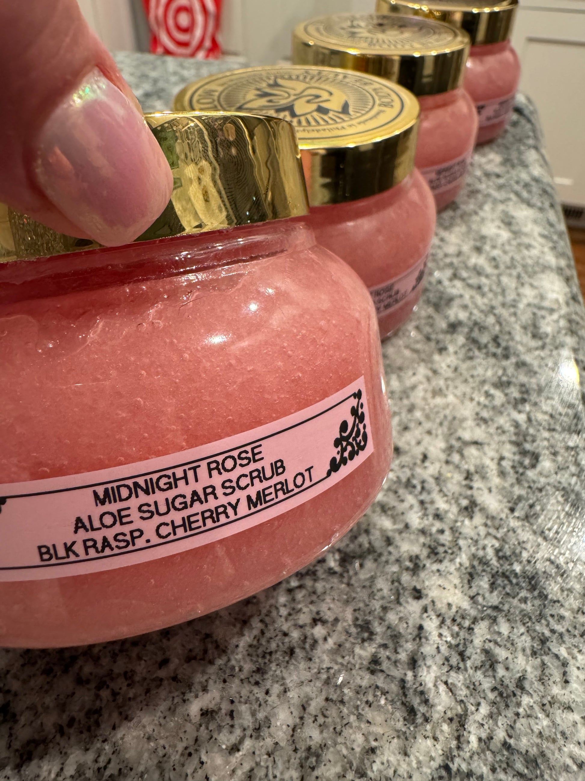 Transform your bath into a luxurious spa experience with our Aloe infused Sugar Scrubs. Made with all-natural fresh ingredients like aloe Vera & vitamin E, this invigorating body exfoliating scrub will leave your skin feeling refreshed and rejuvenated. Packed with scents of black raspberry & black cherry Merlot 💕